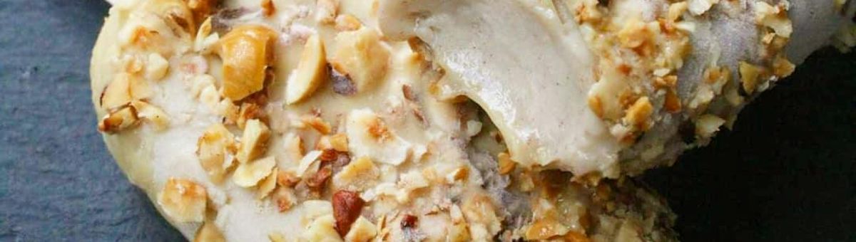 Lust auf Eis, aber keine Lust auf die Standardsorten? Dann schau Dir diese cremige Eiskomposition mit Haselnussmus, veganer weißer Schokolade und gehackten Haselnüssen an.