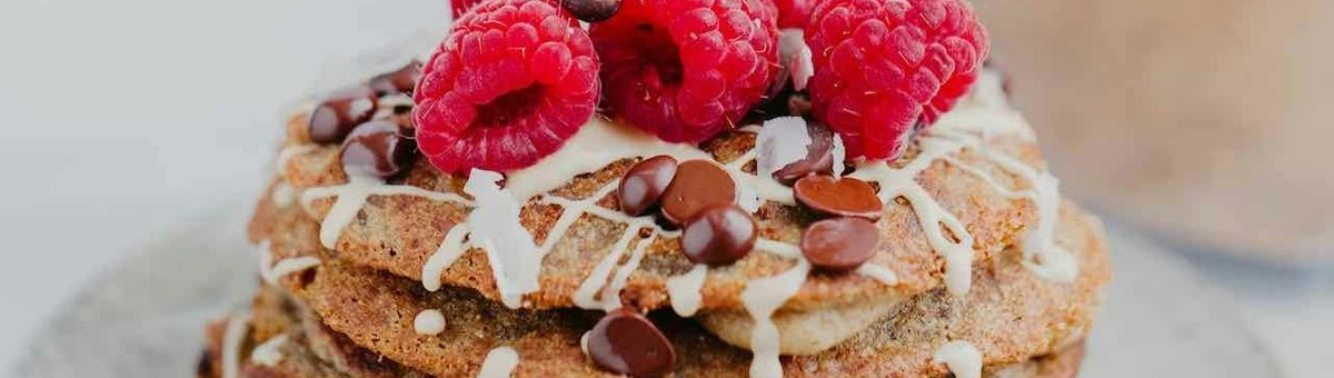 Staple die Pancakes übereinander und garniere sie mit den Himbeeren, Mandelmus, Schokodrops und Kokoschips.