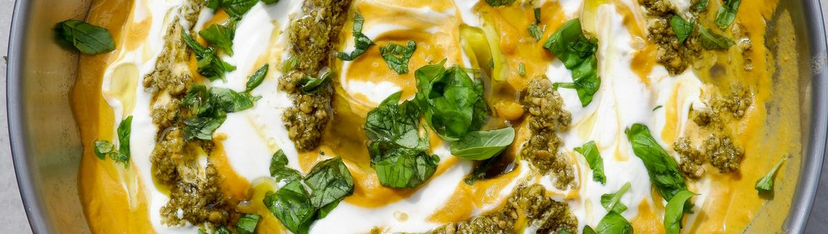 Die cremigen Bohnen mit Joghurt(-alternative), Pesto, etwas frischem Olivenöl und optional frischen Kräutern toppen.
