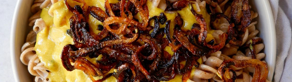 Nudeln mit Soße und Zwiebeln servieren und genießen!