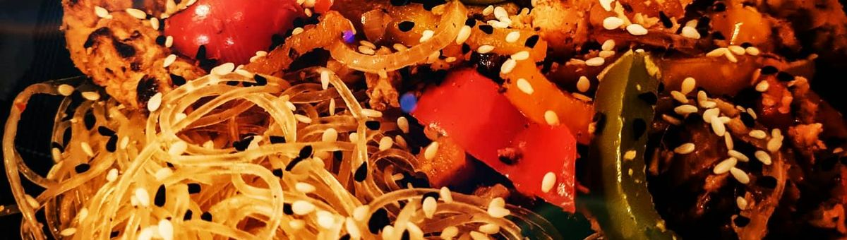 Vegan dish with glass noodles and pea shreds.
