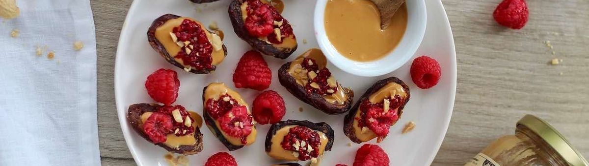 Cut the dates in half, remove the seeds and fill each with a spoonful of peanut butter, as well as the homemade jam.
