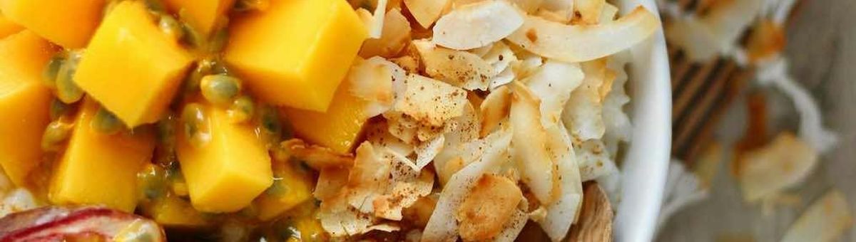 Faire griller les chips de noix de coco dans une poêle sans huile jusqu'à ce qu'elles soient dorées. Mélangez le sucre de coco et la cannelle. Verser le riz au lait dans un bol et le recouvrir de mangue et de fruit de la passion.