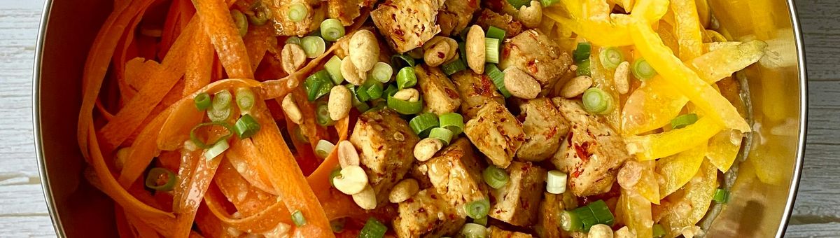 Aggiungere i noodles, le verdure, il tofu e il condimento in una grande ciotola e mescolare bene. Guarnire con le arachidi e servire.