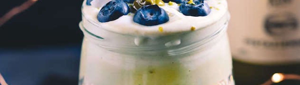 Guarnire il dessert con mirtilli, scaglie di cocco e pistacchi tritati.