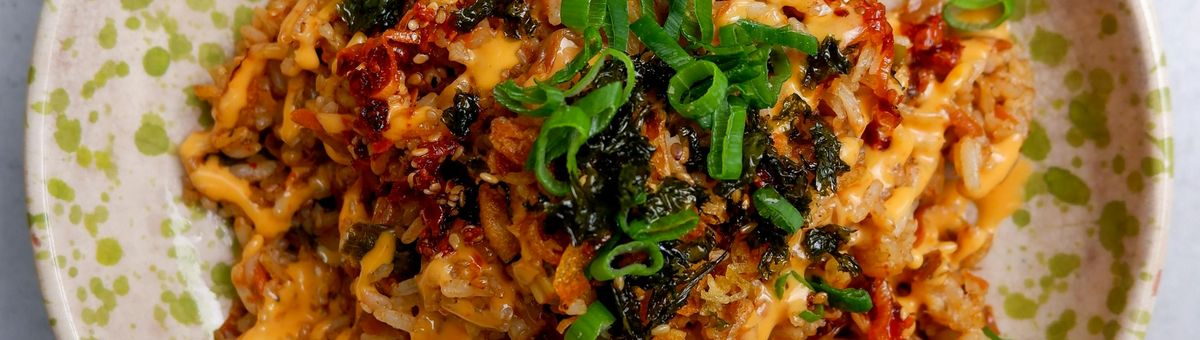 In una padella antiaderente a parte, soffriggere il riso con un po' di margarina per qualche minuto. Aggiungere il composto di kimchi e saltare ancora per qualche minuto.