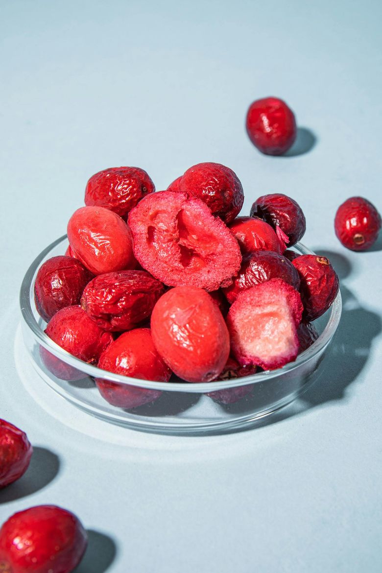 It is often the case that people are advised to choose the fresh alternative instead of dried fruit. The theory is that fresh fruit is healthier because the drying process removes vitamins and minerals from the fruit. But is that true?NO! The vast majority of minerals and vitamins can withstand the drying process without damage and can be preserved. Only vitamin C is sometimes a little sensitive. The gentlest method is freeze-drying, as is the case with our strawberry slices, for example. This preserves all the substances in the strawberries except for the water.