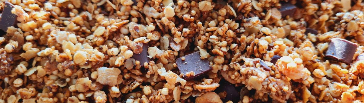 A delicious granola recipe with rolled oats, spelt flakes, amaranth, quinoa, almonds, almond paste, chia seeds, flax seeds, dried blueberries, blossom honey, coconut oil and chocolate drops.