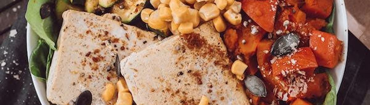 Then chop the pumpkin, zucchini, garlic and tofu, spread on a baking paper, add lemon, the spices and thyme and bake in the oven for 15-20 minutes.