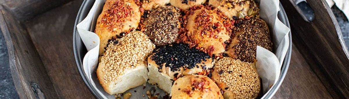 Briefly dip the dough pieces in the oil-butter mixture and then sprinkle with desired toppings.