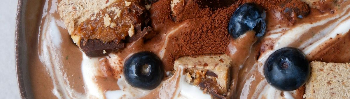 For the smoothie bowl, blend two bananas, ½ courgette (about 150g), 1 tbsp cocoa powder, 200ml plant-based drink, 1 tbsp peanut butter and 35g chocolate protein powder in a blender and pour into a bowl. Top with a yoghurt alternative, cocoa and a few protein bars.
