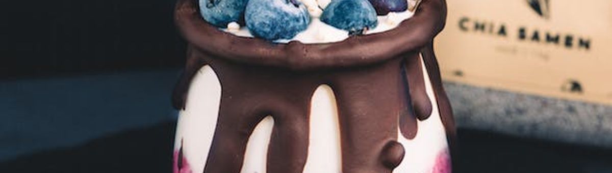 Finally, top the glass with yogurt (or a vegetable alternative) and decorate with blueberries, pink chocolate and quinoa.