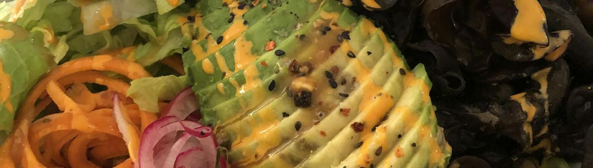Cook the morels and cut the remaining vegetables. For the cucumbers and carrots, a spiral slicer is best for this. Add the morels to the bowl as a base. Arrange the cucumbers, carrots, eggplant, tofu and mango nicely on top.