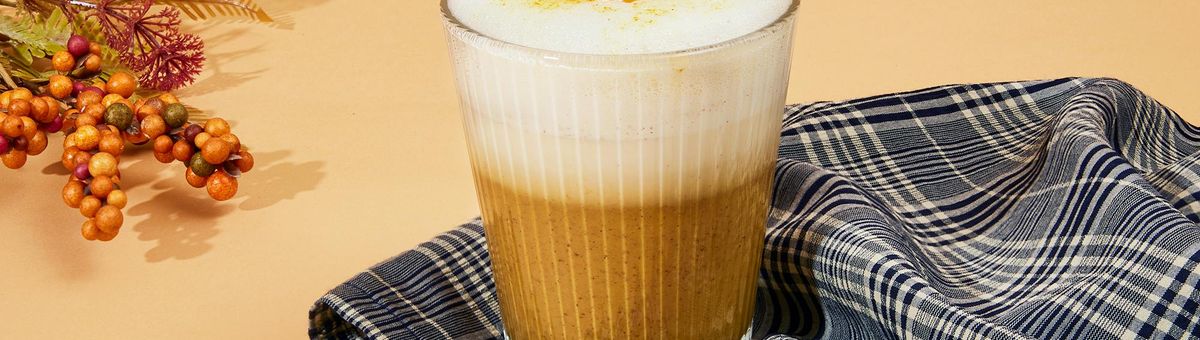 Mix the espresso with the pumpkin puree, the almond butter with pumpkin spice and the maple syrup and pour into a large enough cup.