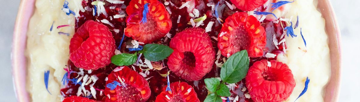 Mix raspberries with 1 tsp. erythritol and cornstarch and bring to the boil in the microwave. Then top the rice pudding with it - done!