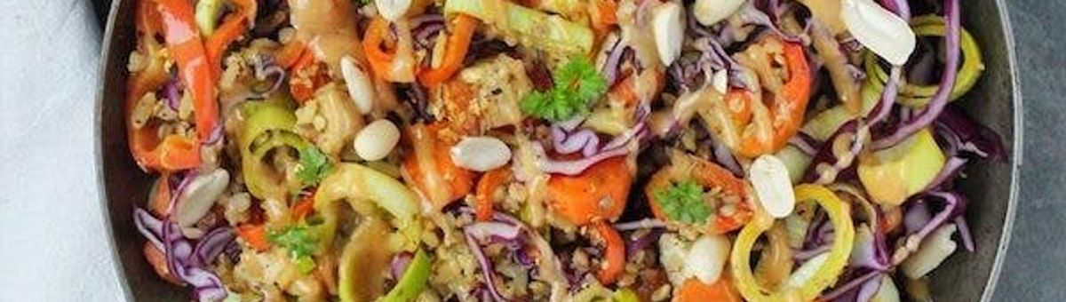 Pour Veggie Stir fry into a bowl and serve with the peanuts and sauce.