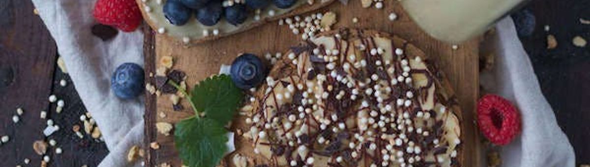 Du kan også riste skiverne, før du topper brødet. Top det ene brød med cashewpuré, blåbær og puffet quinoa. Det andet brød toppes med mandelpuré, banan, smeltede chokoladedråber og puffet quinoa. Til det tredje brød bruger du yoghurt, hindbær, brombær og granola.