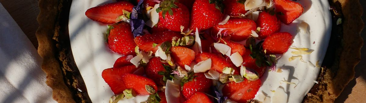 Derudover kan du pynte med spiselige blomster og kokosflager, hvis du har lyst – og så er tærten ellers klar til at blive nydt!