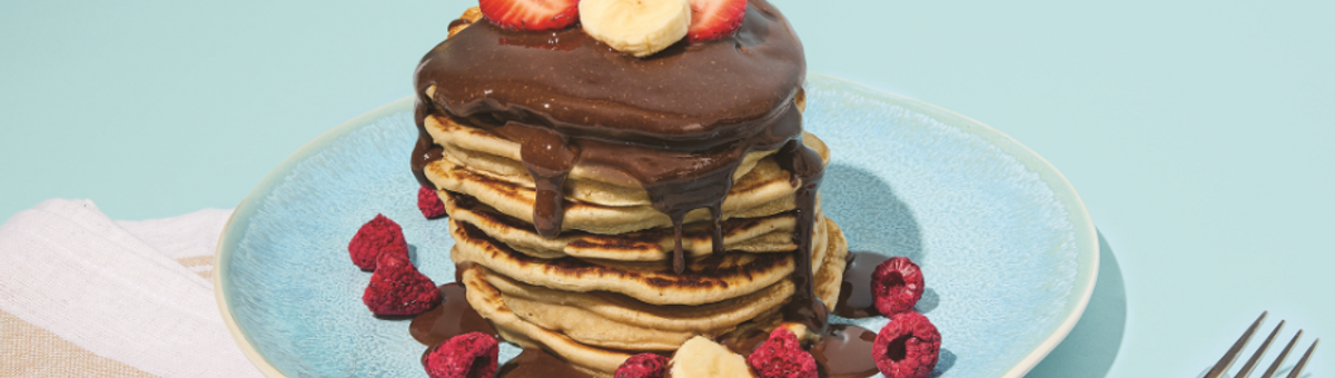 Empilez les pancakes dans une assiette et ajoutez-y les toppings de votre choix : crème cacao - noisette crunchy, quelques fraises / framboises lyophilisées et des fruits frais.