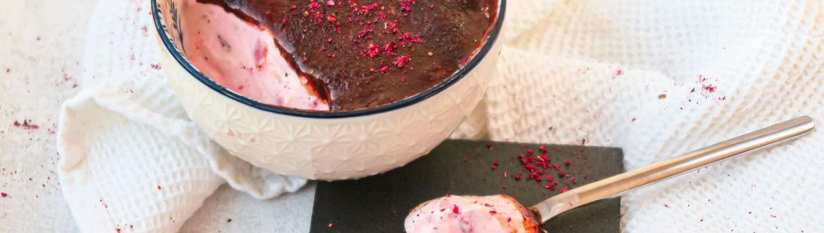 Deliziosa crema di quark alla fragola con strato di cioccolato proteico.