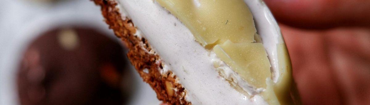 Transferir a mistura para um saco de pasteleiro com um bico grande e dividir entre as bases de amêndoa. Colocar simplesmente no centro de cada uma e pressionar a direito (não em círculo).