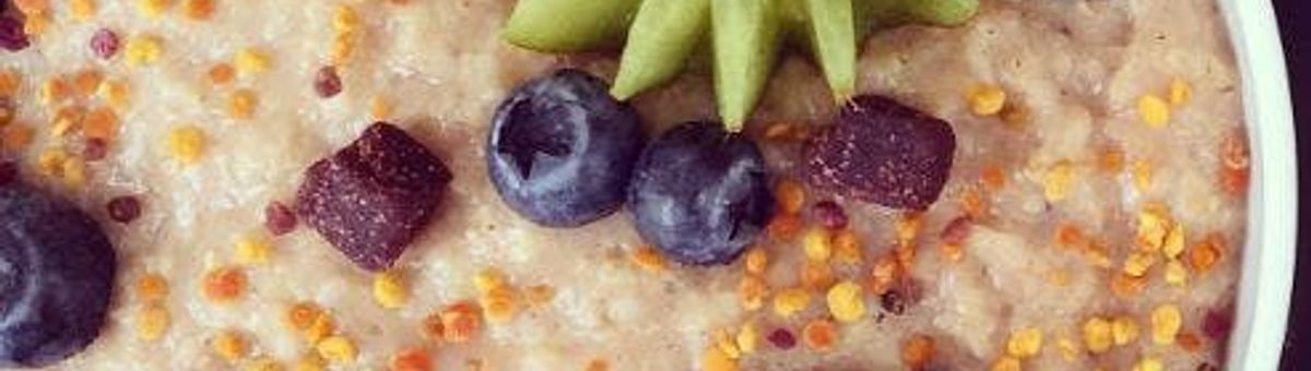Lägg sedan allt i en skål och dekorera din havregrynsgröt med toppings som kiwi, blåbär, pollen och acai-kuber.